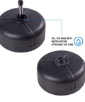 - The base is made of plastic and should be filled with water before use. When fully filled with water the base will weigh up to 140lbs.