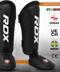 Step into the ring with confidence, knowing your shins are fully protected with RDX's high-performance shin guards. Light yet durable, these shin insteps are designed to provide maximum protection without slowing you down. Created using a groundbreaking gel cushioning system, these guards deliver excellent shock distribution. Complemented by foam padding, they offer additional resistance against harsh blows. Our advanced QD-1 lining ensures moisture management, preventing sweat buildup and unpleasant odors. With a secure strap system, these shin guards stay in place, allowing you to focus on your performance. Experience the pinnacle of in-ring comfort, moulded to perfection and approved by FIGMMA and SATRA TECHNOLOGY.