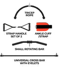 This product also includes accessories such as a tricep rope, strap handles (set of 2), an ankle cuff/strap, a small rotating bar, and a universal cross bar with eyelets.
