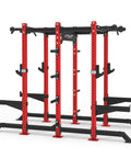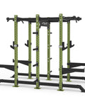 Dual-sided uprights and spacious depth allow multiple lifters to train at once.