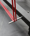 Long enough to be used through a 3x3" rack, with plenty of space remaining for small to heavy (wide) bands. I have used over 100lbs of band tension on a peg without issue.