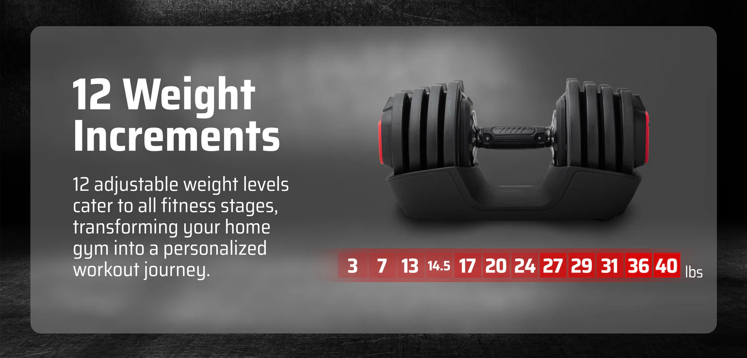 Elevate your fitness game with AmStaff's adjustable dumbbell. Choose from 12 distinct weight levels to customize your workout exactly how you want it. Plus, save 90% more storage space compared to traditional weight sets. It's not just a dumbbell; it's your personalized, space-efficient gym solution.