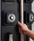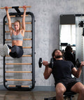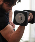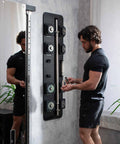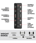 A wall-mounted set that transforms from dumbbells to a barbell with 24 pieces of 2.2lb and 4 pieces of 1.1lb adjustable plates for a customizable workout.