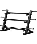 This Dumbbell rack will fit 5-50lbs urethane dumbbells with space still avalaiable. There is also space for weight plates on the side bars.