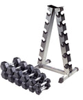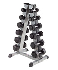 Comprend le support d'haltères vertical AmStaff TR040 à 6 paires Chaque niveau est décalé, permettant un accès illimité aux haltères. Placez-le contre un mur ou centrez-le dans une pièce. La construction en acier épais offre une durabilité maximale et de meilleures performances dans moins d'espace. Parfait pour les haltères hexagonaux et hexagonaux en caoutchouc de 5 lb à 30 lb (incréments de 5 lb).