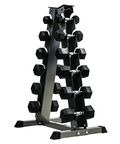 Support d'haltères vertical Le support d'haltères vertical à deux niveaux de conception unique peut contenir 6 paires d'haltères hexagonaux. Chaque niveau est décalé, permettant un accès illimité aux haltères. Placez-le contre un mur ou centrez-le dans une pièce. La construction en acier épais offre une durabilité maximale et de meilleures performances dans moins d'espace. Parfait pour les haltères hexagonaux et hexagonaux en caoutchouc de 5 lb à 30 lb (incréments de 5 lb).