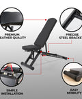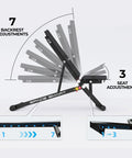 Introduces a superior level of versatility with its 7 back adjustments and 3 seat adjustments, including flat, incline and decline positions.