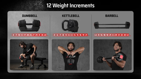 Easily switch between dumbbell, barbell, and kettlebell modes.